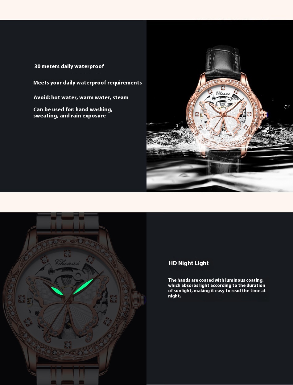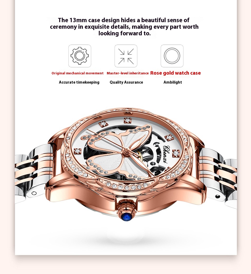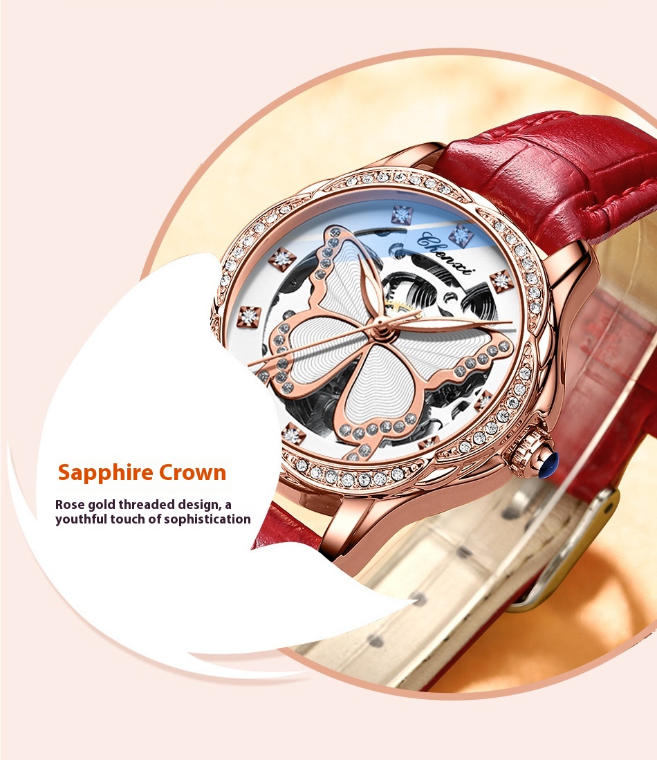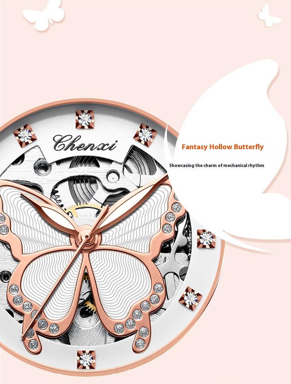 Butterfly Dial Fashion Diamond-embedded Watch Women's Waterproof Automatic Mechanical Watch
